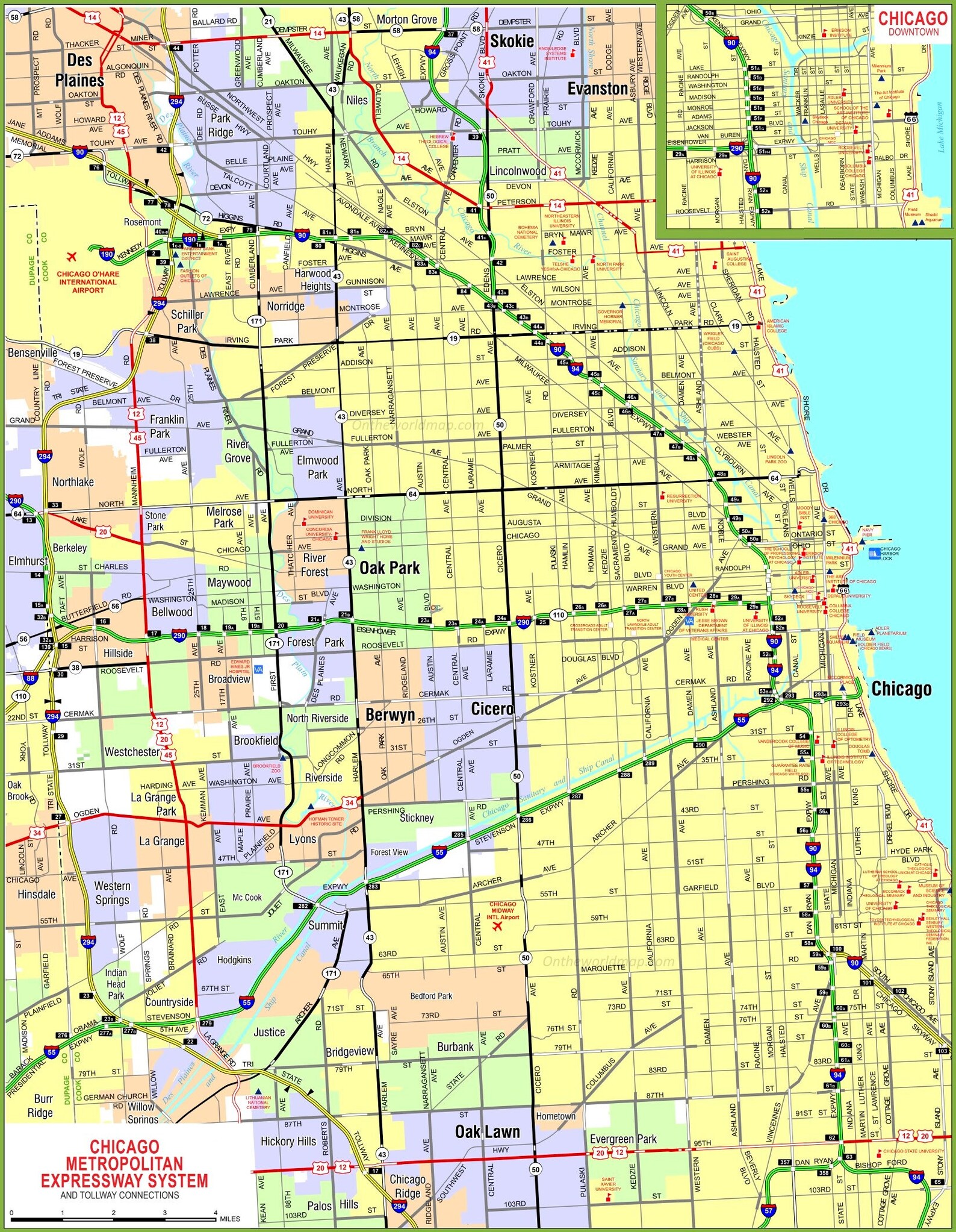 Chicago's eastern boundary is formed by Lake Michigan, and the city is divided by the Chicago River into three geographic sections: the North Side, the South Side and the West Side. You can jump into the streets of Chicago right now thanks to this page and explore all the beauties of the city. The highly detailed inset of the Chicago.