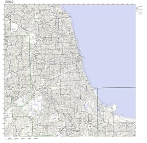 A detailed Chicago, Illinois Wall Map combines two maps in one, along with a street-level map of Chicago downtown showing cities, towns, highways and roads.